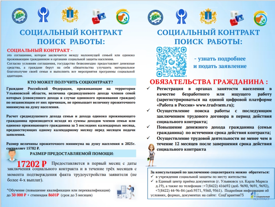 Граждане при заключении социального контракта по поиску работы берут на себя обязательство трудоустроиться (заключить трудовой договор) в Ульяновской области, улучшив материальное благополучие своей семьи.