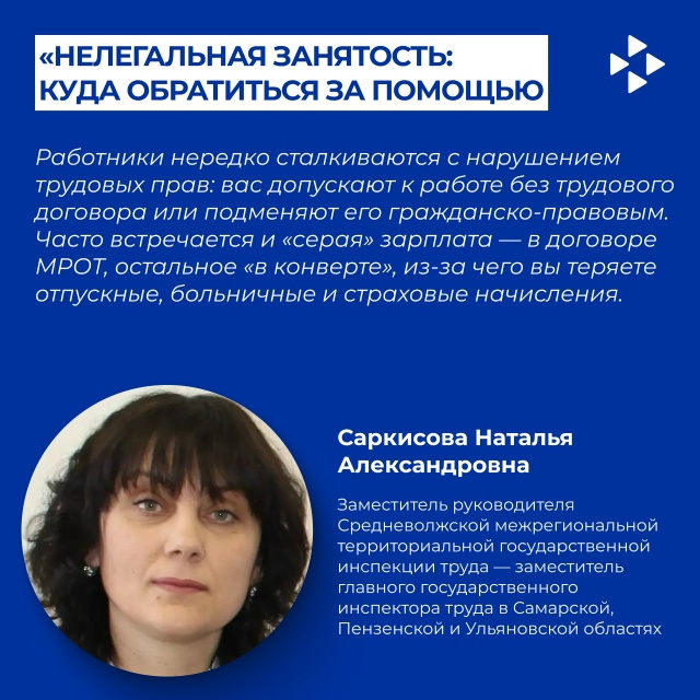 В случае если Вы или Выши близкие стали невольной жертвой выплаты зарплаты «в конверте», если Ваши отношения с работодателем не оформлены, с Вами работодатель не хочет заключать трудовой договор, или о других фактах нелегальной занятости, можно сообщить в Средневолжскую межрегиональную территориальную инспекцию труда (Ульяновск) по адресу: город Ульяновск, улица Гончарова, д. 44, через сервис «Онлайнинспекция.РФ», либо в межведомственную комиссию по противодействию нелегальной занятости в Ульяновской области по телефону 41-72-04 или на адрес электронной почты: uprtrud@mail.ru.