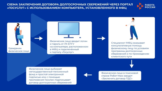 Заключить договор долгосрочных сбережений можно через портал Госуслуг в секторе пользовательского сопровождения МФЦ.