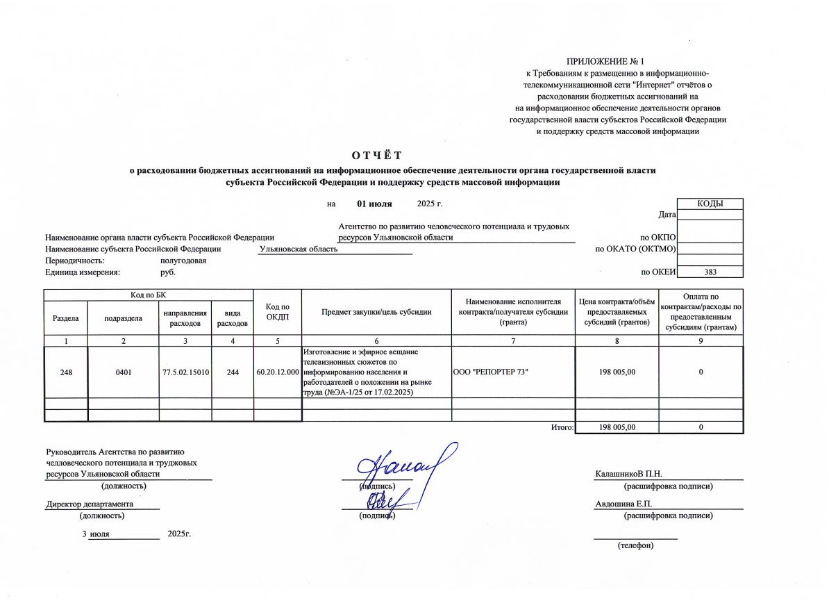 Отчет о расходовании бюджетных ассигнований на информационное обеспечение деятельности органа государственной власти субъекта Российской Федерации и поддержку средств массовой информации на 1 июля 2025 год