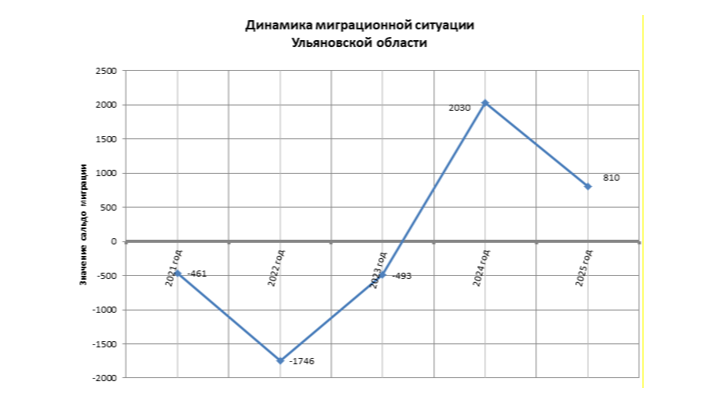 По данным Ульяновскстат за январь - март 2025 года число прибывших на территорию Ульяновской области составило 4768 человек, число выбывших 3958 человек. Учитывая приведенные цифры, сальдо межрегиональной миграции Ульяновской области, характеризуется положительными величинами и составляет 810 человек (за аналогичный период 2024 года -88 человек).